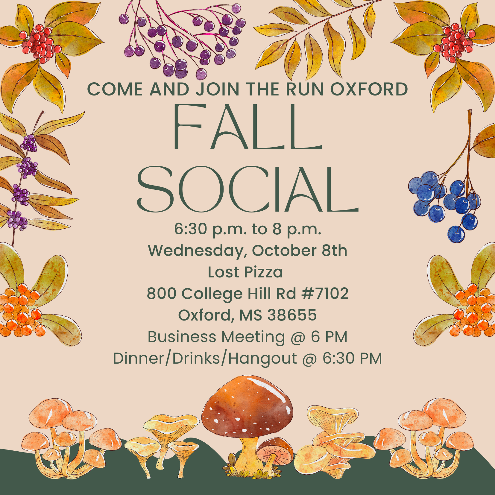We'll have our Fall Social at Lost Pizza on October 8th. Our seasonal socials bring together all the runners from across our many group runs to hang out as a group in normal clothes and comfort! We'll open with a short business meeting and then enjoy dinner and drinks so come on by!